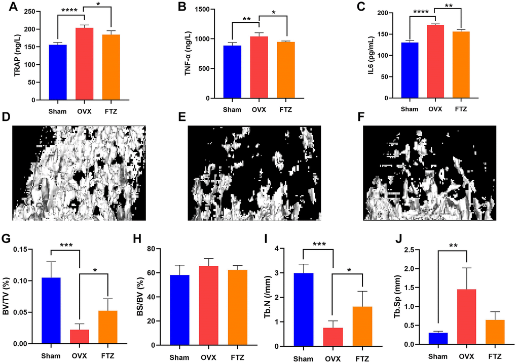 To further assess the therapeutic effect of FTZ on osteoclastogenesis in vivo, we established OVX mice model. After 12 weeks of treatment, the mice were sacrificed, and their left femurs and serum were used for further analysis by Micro-CT and ELISA (Figure 8). Serum E2 levels of mice in the OVX group were significantly decreased compared with the sham group, while in the FTZ group they were significantly higher compared to the OVX group (Figure 8A). Moreover, FTZ treatment was able to reverse the increased serum levels of TRAP, TNF-α, and IL-6 induced by OVX (Figure 8A–8C).