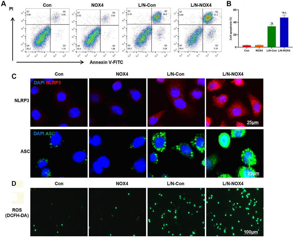 LPS and Nigericin induced inflammatory response and inflammatory injury in KCs. In the absence of intervention, NOX4 overexpression did not cause injury to KCs. The cell injury level in L/N-NOX4 group was significantly higher than that in L/N-Con group, indicating that NOX4 promoted KCs injury under inflammatory condition (Figure 1A, 1B). In IF staining, L/N promoted the activation of NLRP3 inflammasome, and up-regulated the levels of NLRP3 and ASC. Apart from that, NLRP3 and ASC levels further increased in L/N-NOX4 group, which were higher than those in L/N-Con group (Figure 1C). In ROS detection, ROS expression decreased in Con and NOX4 groups, while L/N promoted ROS expression, and the number of positive cells increased. The number of positive cells in L/N-NOX4 group further increased, indicating that NOX4 promoted ROS expression under inflammatory condition (Figure 1D).