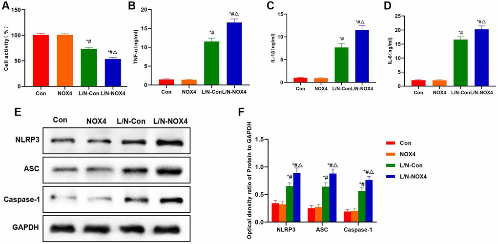 Results of cell viability assay also indicated that, NOX4 promoted the down-regulation of cell viability under inflammatory condition, and the cell viability of L/N-NOX4 group was significantly lower than that of L/N-Con group (Figure 2A). As discovered from inflammatory factor detection, LPS and Nigericin promoted the expression and release of inflammatory factors, and the levels of IL-6, TNF-α and IL-1β were significantly higher than those in Con and NOX4 groups. While the expression levels of inflammatory factors in L/N-NOX4 group were further up-regulated, which were higher than those in L/N-Con group (Figure 2B–2D). Protein detection results also suggested that, LPS and Nigericin promoted NLRP3 activation, and markedly up-regulated the levels of NLRP3, ASC and Caspase-1. NOX4 overexpression further promoted NLRP3 activation, and the levels of NLRP3, ASC and Caspase-1 in L/N-NOX4 group were higher than those in L/N-Con group (Figure 2E, 2F).