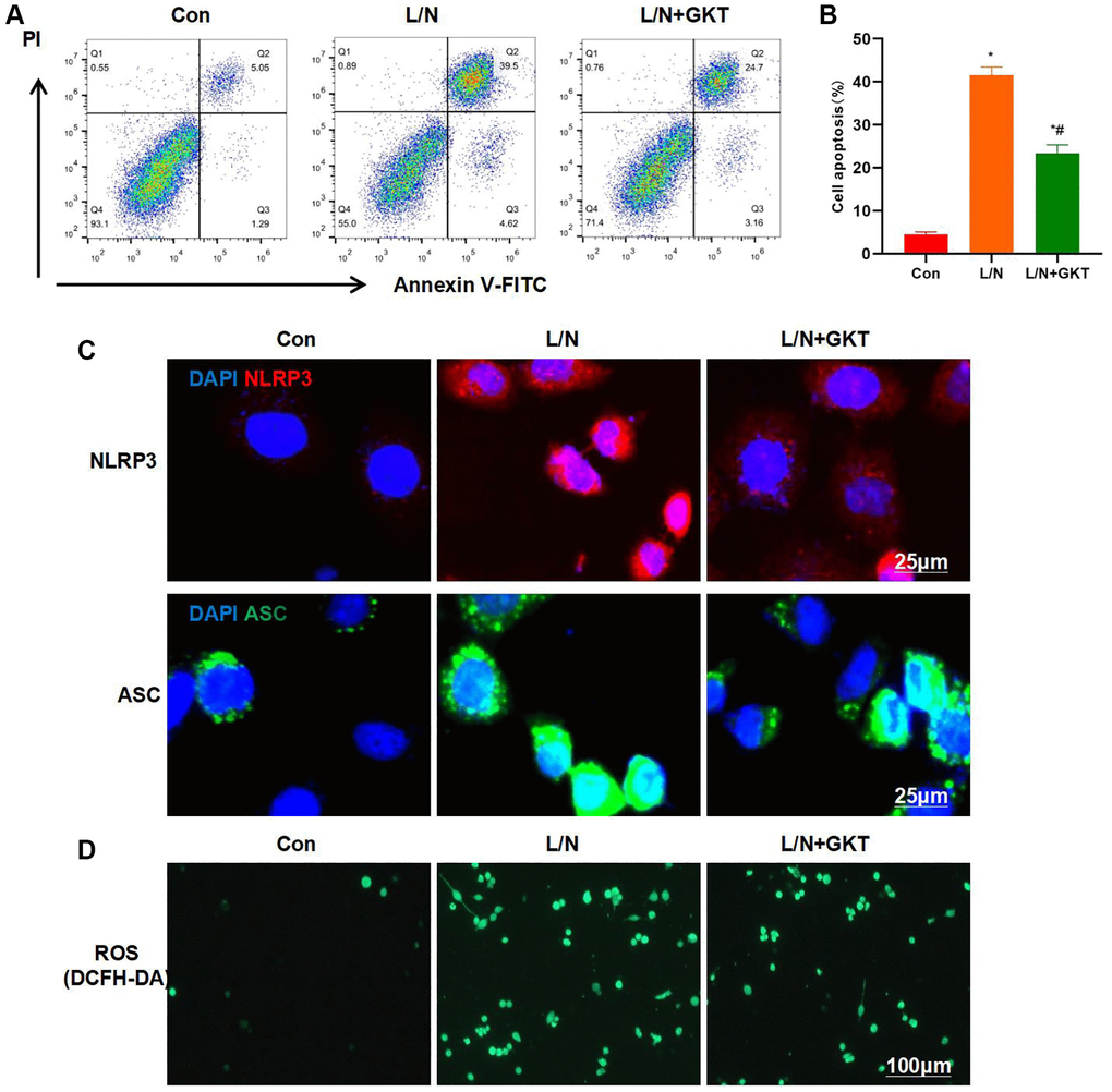 GKT137831, the highly selective inhibitor of NOX4, was used for pretreatment. After GKT was used to suppress NOX4 expression, it resisted the LPS- and Nigericin-induced KCs injury. FCM results demonstrated that, the cell apoptosis level in L/N + GKT group significantly decreased, lower than that in L/N group (Figure 3A, 3B). Meanwhile, IF staining results suggested that, GKT suppressed the activation of NLRP3 inflammasome, and the expression levels of NLRP3 and ASC dramatically decreased, lower than those in L/N group (Figure 3C). As discovered after DCFH-DA probe detection, GKT suppressed ROS expression, and the number of positive cells significantly decreased, lower than that in L/N group (Figure 3D).