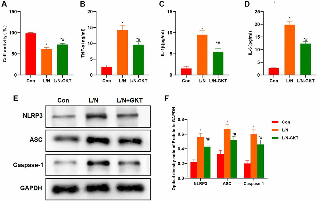 According to cell viability assay, GKT improved cell viability, which was higher than that in L/N group (Figure 4A). At the same time, GKT decreased the expression of inflammatory factors, and the levels of IL-6, TNF-α and IL-1β in L/N + GKT group remarkably decreased, lower than those in L/N group (Figure 4B–4D). Protein detection also discovered that, after GKT suppressed NOX4, the activation of NLRP3 inflammasome was suppressed, and the expression levels of NLRP3, ASC and Caspase-1 decreased, significantly lower than those in L/N group (Figure 4E, 4F).