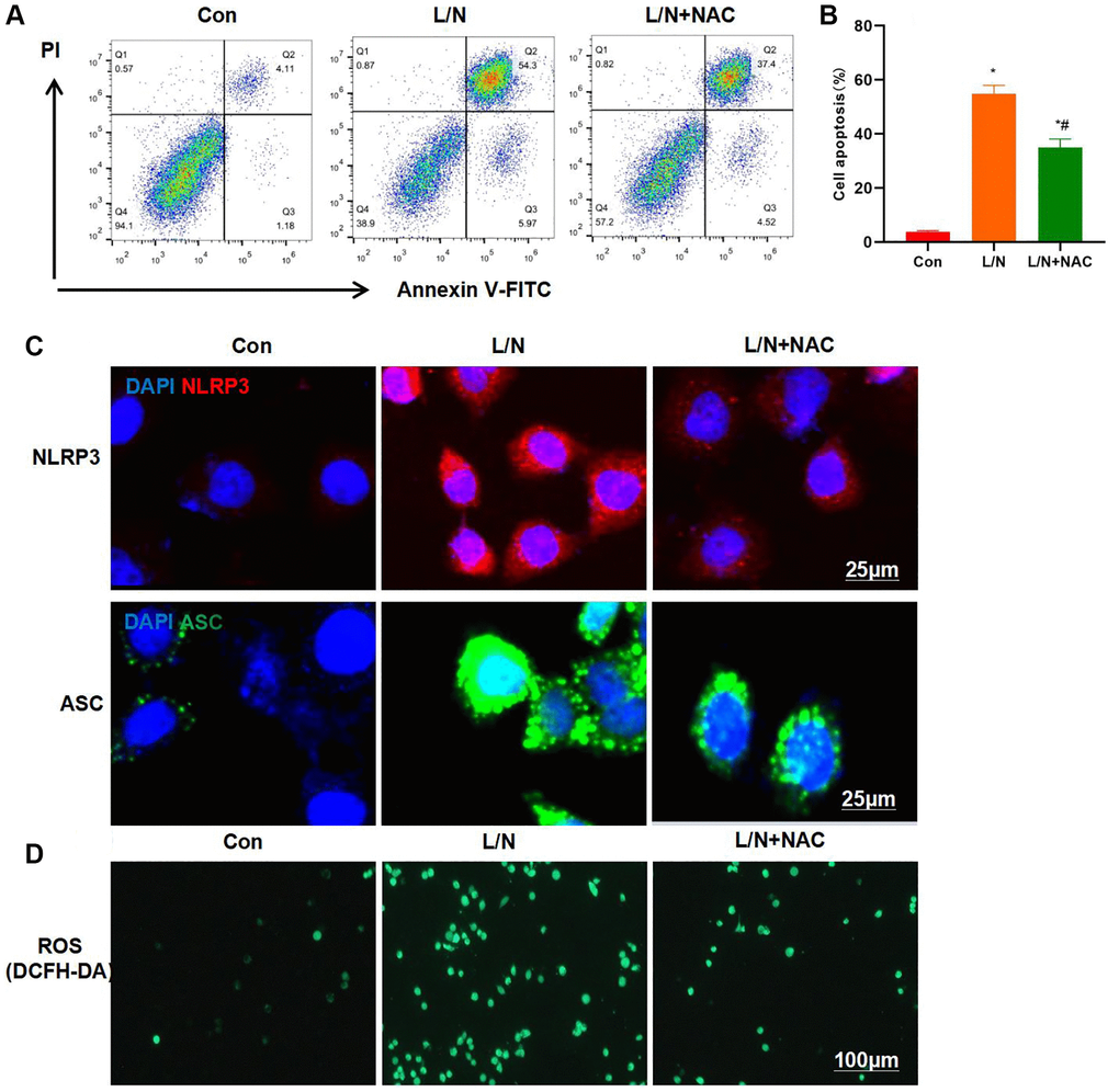 ROS are generated by NOX4. Therefore, cells were pretreated with the ROS inhibitor NAC in the current work. As a result, NAC also suppressed the inflammatory injury in KCs. Moreover, NAC resisted the LPS- and Nigericin-induced KCs injury. As revealed by FCM assay, the cell apoptosis level in L/N + NAC group significantly decreased, lower than that in L/N group (Figure 5A, 5B). Similarly, IF staining results also revealed that, NAC inhibited the activation of NLRP3 inflammasome, and the expression levels of NLRP3 and ASC were markedly down-regulated, lower than those in L/N group (Figure 5C). It was discovered after detection with DCFH-DA probe that, NAC suppressed ROS expression, and the number of positive cells significantly declined, which was lower than that in L/N group (Figure 5D).