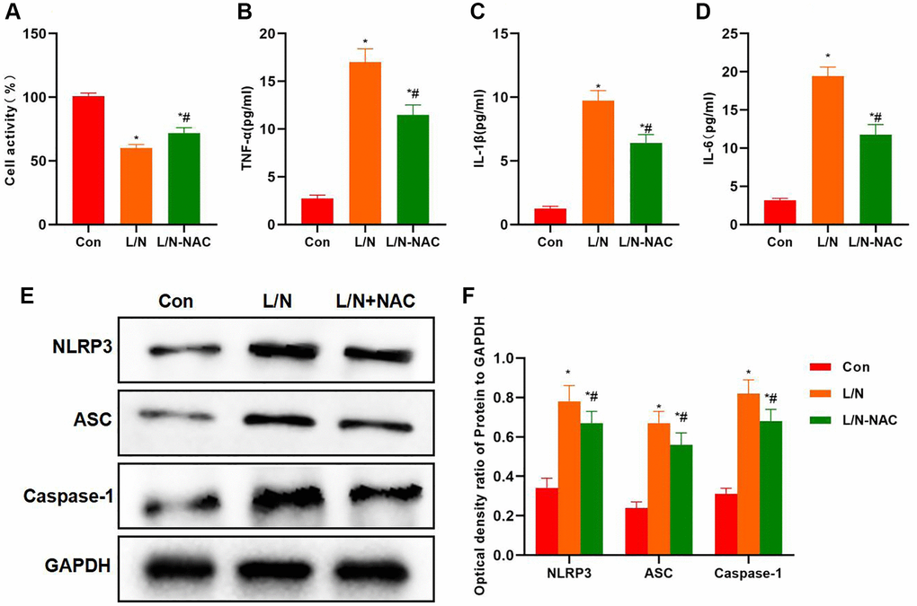 Cell viability assay found that NAC improved cell viability, which was higher than that in L/N group (Figure 6A). Meanwhile, NAC reduced the expression of inflammatory factors, and the levels of IL-6, TNF-α and IL-1β in L/N + NAC evidently declined, lower than those in L/N group (Figure 6B–6D). Protein detection also suggested that, NAC suppressed the activation of NLRP3 inflammasome, and reduced the expression of NLRP3, ASC and Caspase-1, which was significantly lower than that in L/N group (Figure 6E, 6F).