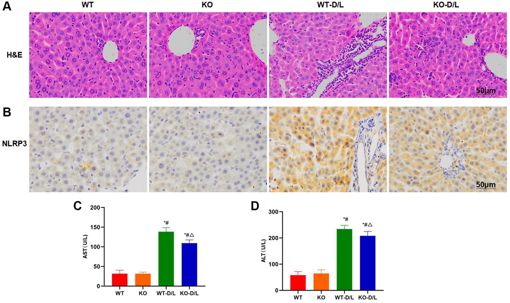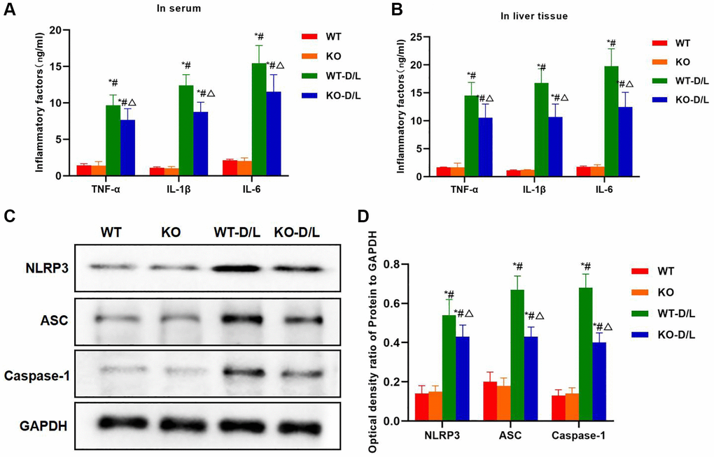 Inflammatory factors were detected in serum and tissues. As a result, the levels of IL-6, TNF-α and IL-1β in serum and liver tissues of WT-D/L group evidently elevated, higher than those in KO and WT groups while the differences were not significant between KO and WT groups. The levels of inflammatory factors in tissues and serum of KO-D/L group decreased, lower than those in WT-D/L group (Figure 8A, 8B). Protein expression results demonstrated that, NLRP3 in WT-D/L group was activated, and the levels of NLRP3, ASC and Caspase-1 were remarkably higher than those in WT and KO groups, while the protein levels decreased in KO-D/L group, lower than those in WT-D/L group (Figure 8C, 8D).