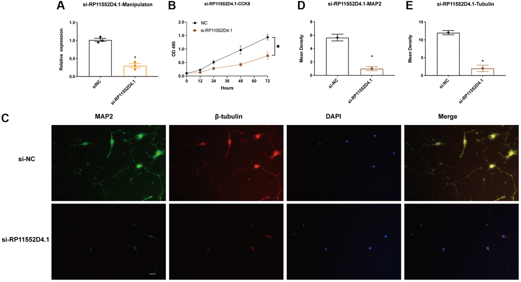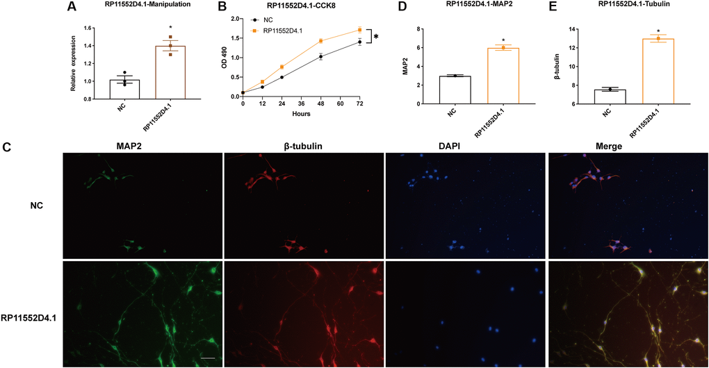 From both TCGA and CGGA dataset, a similar trend between the expression of RP11-552D4.1 and survival outcome was identified, we next investigated the effect of RP11-552D4.1 on primary cultured neurons. Si- RP11-552D4.1 was used to knock down the expression of RP11-552D4.1 and si-NC was used as a control. CCK-8 assays indicated that primary cultured neurons transfected with si-RP11-552D4.1 showed decreased cell proliferation (Figure 9A and 9B). Similarly, transfection with si- RP11-552D4.1 also significantly reduced the expression of MAP2 and β-tubulin in cell culture (*P < 0.05, Figure 9C–9E). In contrast, overexpressed RP11-552D4.1 could upregulate the CCK level of primary neurons and increase the expression of MAP2 and β-tubulin as well (Figure 10).