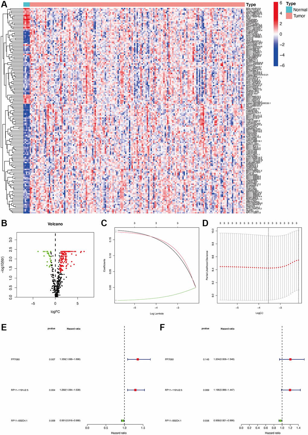We only included patients with GBM holding effective survival data from 2 days to 3881 days. Both univariate and multiple Cox model was used to assess the relationship between m6A-related lncRNAs and the survival status of GBM patient (P < 0.05). Risk score = Coefficient of mRNA × lncRNAs. The least absolute shrinkage and selection operator (LASSO) method is further applied to identify the exact coefficient of each DEmlncRNA based on the survival status. R packages “survival” and “survminer” were used to compare the survival status between the high-and low-risk group.