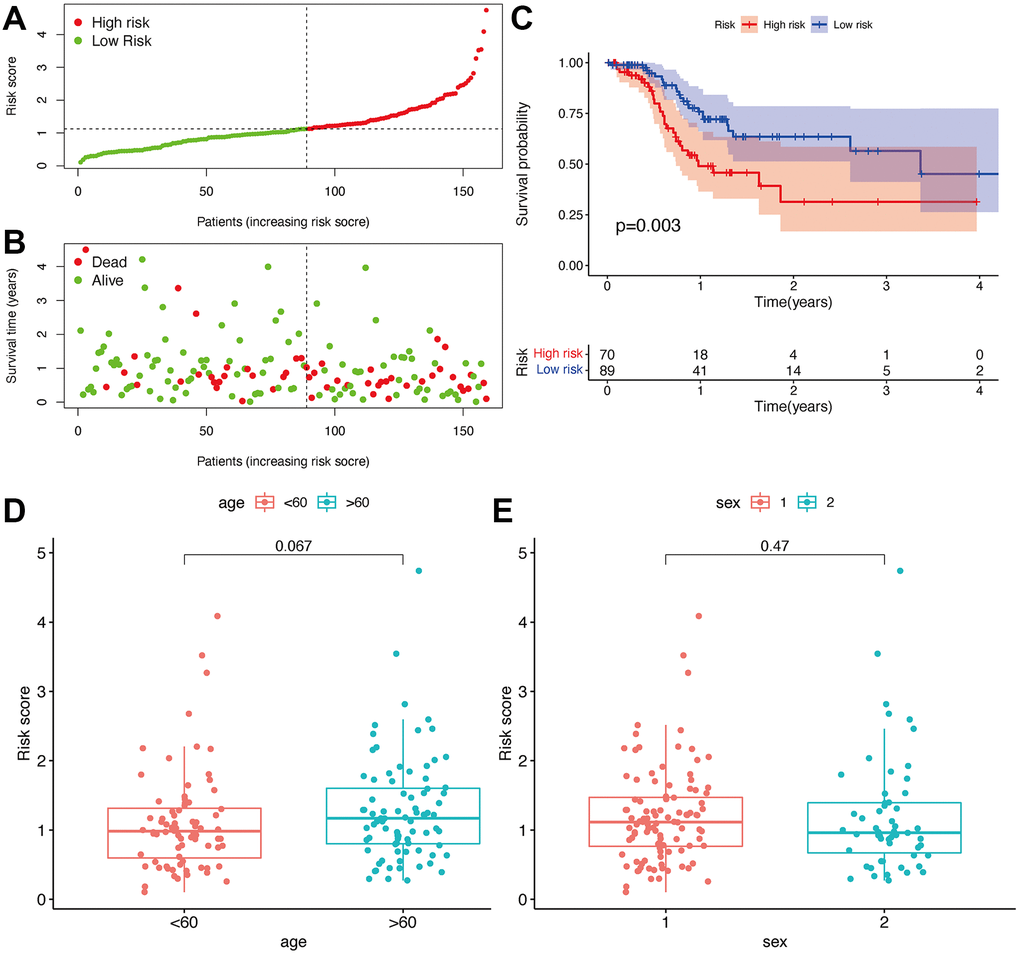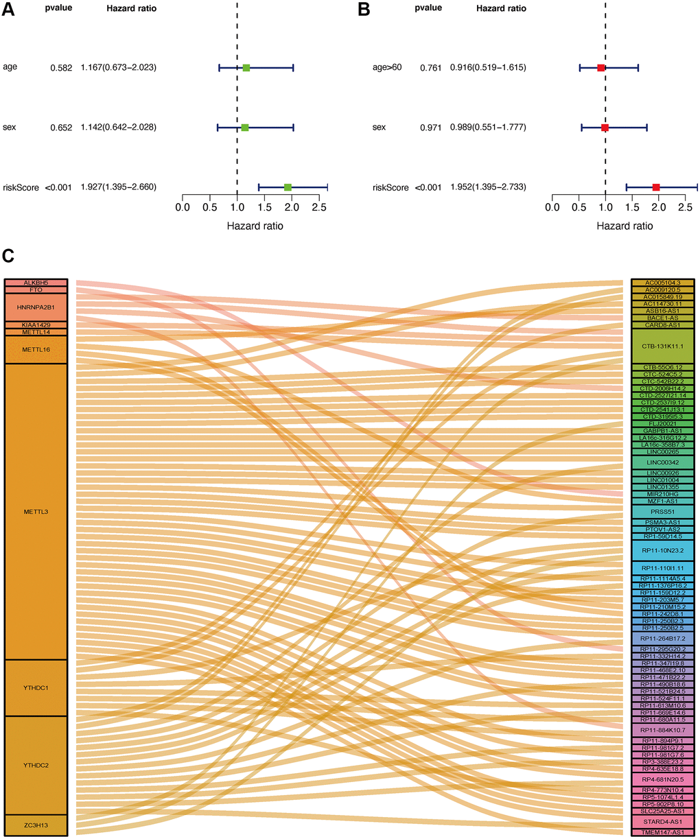 Seventy cases and 89 cases were classified into high- and low-risk groups based on the cut-off value. Figure 4A and 4B show the riskScores and survival rate of each patient. We found the outcome in patients from the high-risk group was poorer than that from the low-risk group, shown by KM analysis (p = 0.003) (Figure 4C). Then, a Chi-square test was applied to investigate the relationship between the risk model in GBM and clinical features. The scatter plots examined through Wilcoxon signed-rank test displayed age and gender (Figure 4D, 4E) were not significantly correlated with the risk model. Consequently, univariate and multiple Cox model showed that riskScores is an independent predicting factor (p < 0.001, HR = 1.927, 95% CI [1.395–2.660]) (Figure 5A), and riskScores (p < 0.001, HR = 1.952, 95% CI [1.395–2.733]) (Figure 5B). The m6A-lncRNA coexpression network was visualized using the Sankey diagram in Figure 5C, and 152 m6A-related lncRNAs were discerned as m6A-related lncRNAs.