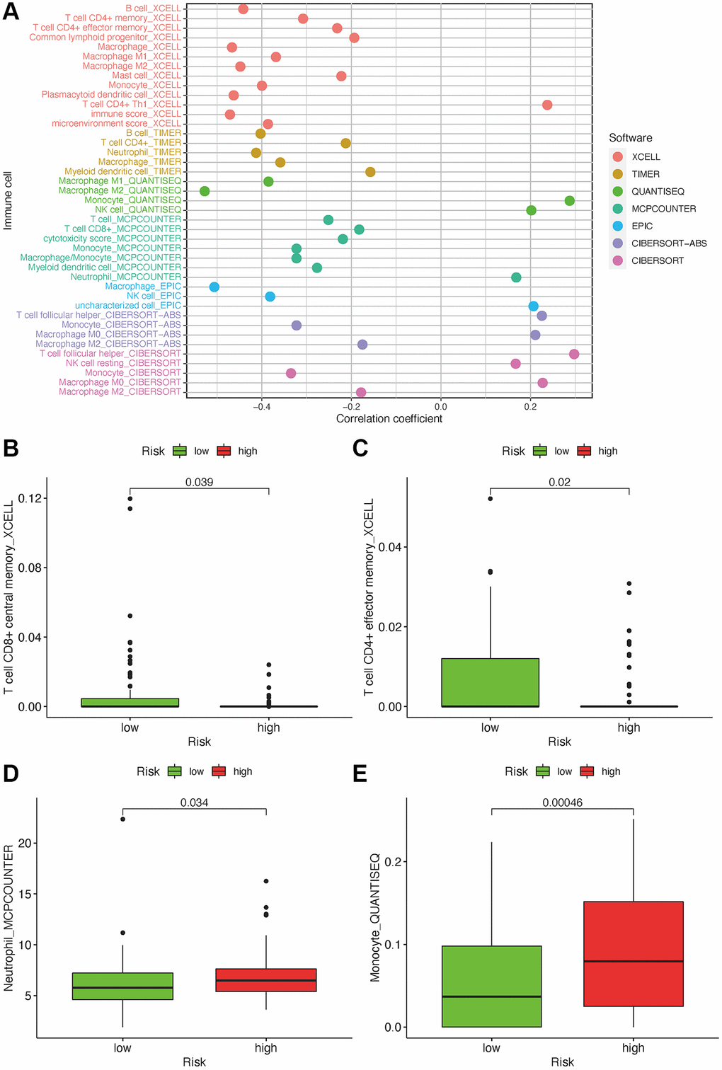 We next investigated the association between risk group and TILs, with different immune infiltration analysis algorithm. Wilcoxon signed-rank test was used to compare the number of TILs between high- and low-risk groups. The correlation between riskScores and TILs was investigated by the Spearman method. A lollipop plot shows the correlation coefficient.