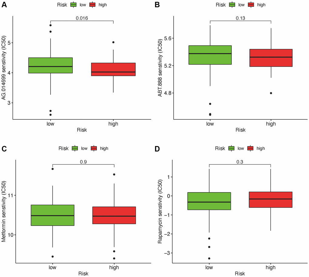 Besides the relationship with ICIs, we further explored the relationship between the risk and efficacy of commonly used chemotherapy drugs for GBM. The results showed that the high-risk group had a higher half inhibitory concentration (IC50) of chemotherapy drugs for metformin (p < 0.05), while a lower IC50 for AG.014699, PARP inhibitor (p < 0.001), indicating that this risk model could be used as a potential predictor for the chemotherapy sensitivity (Figure 8A–8D).