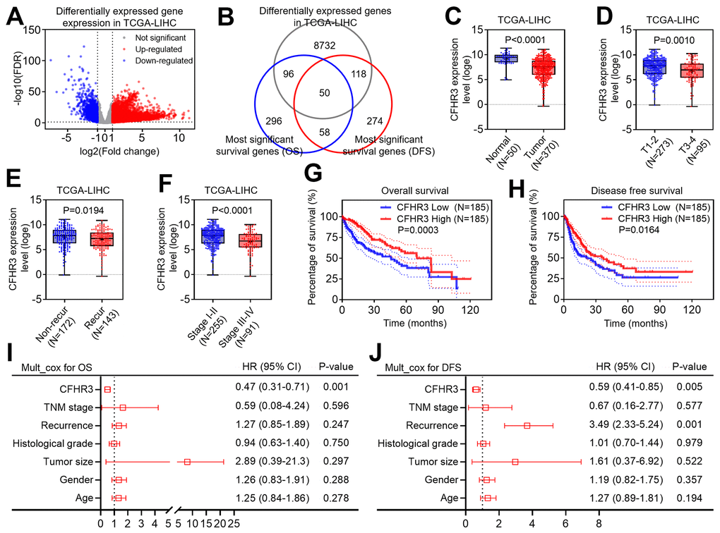 Level-3 transcriptomic data were obtained from the TCGA platform (https://portal.gdc.cancer.gov/). The liver cancer dataset harbors the RNA sequencing data from 370 tumors together with 50 non-tumor samples. The “edgeR” package was used for calculating the gene expression levels. Candidate genes were preliminarily screened and validated by the GEPIA2 online database as previous description [16, 17]. The top 500 genes related to the prognoses of HCC patients were figured out by using the “Most Differential Survival Genes” module on the GEPIA2 website. The median of gene expression levels was used as the expression cut-off for Kaplan-Meier analyses in OS/DFS. The gene enrichments upon CFHR3 levels in HCC were analyzed by the Gene Set Enrichment Analysis (GSEA) program [18]. The miRNA bindings of the CFHR3 3’UTR region were analyzed by the TargetScan program [19].