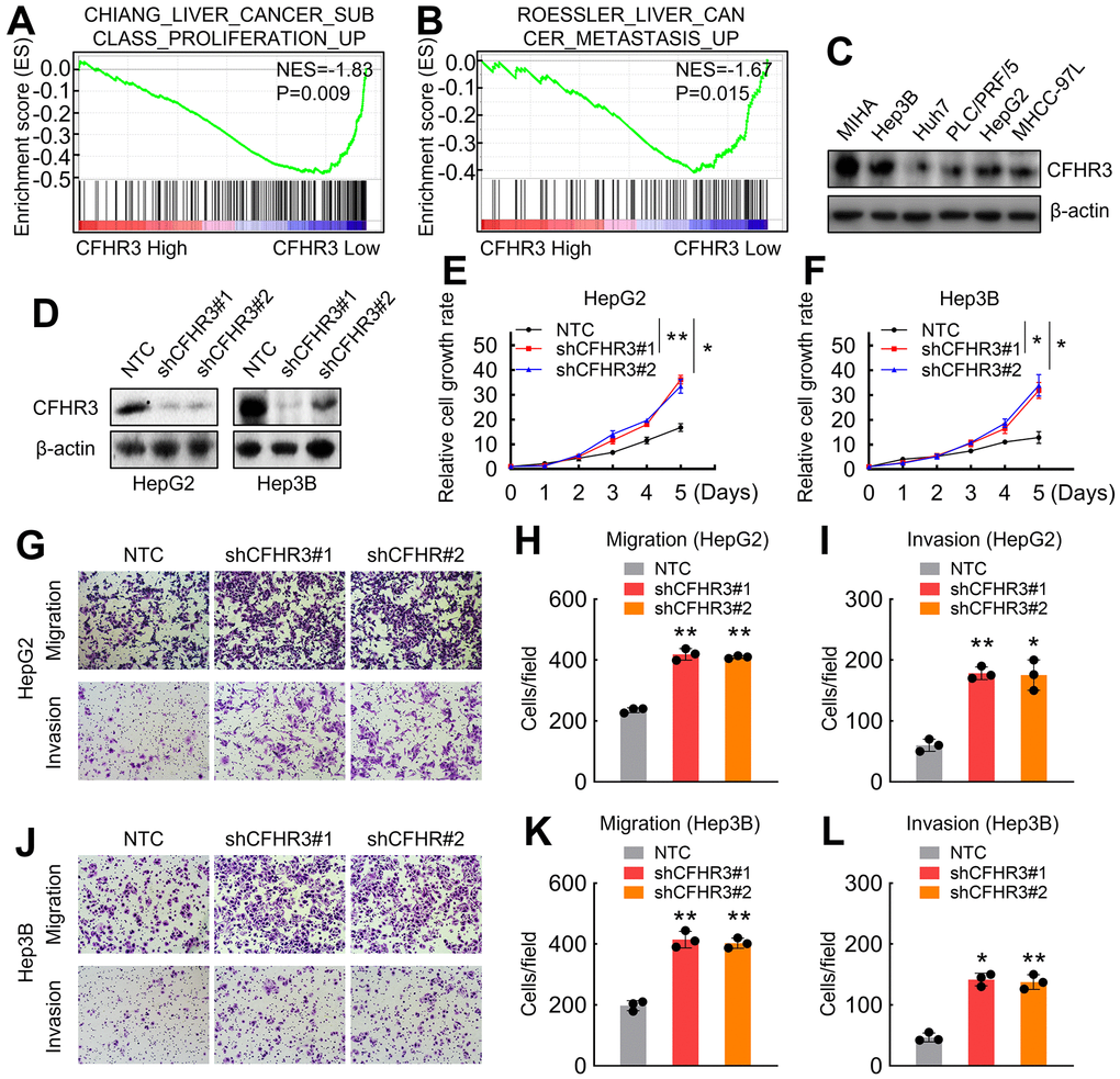 To demonstrate the biological roles of CFHR3 in HCC progression, functionally related gene signatures upon CFHR3 expression levels in HCC were analyzed. The GSEA results revealed that liver cancer proliferation and metastasis-related gene signatures, such as “Chiang Liver Cancer Subclass Proliferation Up” and “Roessler Liver Cancer Metastasis Up”, were enriched in HCC cases with CFHR3Low (Figure 2A, 2B). To further validate the roles of CFHR3 in HCC cell growth and metastasis, CFHR3 levels were investigated in different HCC cells and normal hepatocytes (MIHA cells). It showed that CFHR3 was highly expressed in two HCC cell lines (HepG2 and Hep3B) and the MIHA cells, and it was low expressed in Huh7, PLC/PRF/5, and MHCC-97L cells (Figure 2C). Cell functional assays showed that Huh7, PLC/PRF/5 and MHCC-97L cells harbor higher capabilities of cell growth and migration (Supplementary Figure 1A–1C), indicating that CFHR3 is a crucial factor inhibiting HCC progression. Furthermore, we conducted CFHR3 knockdown in HCC cell lines (HepG2 and Hep3B) as well as the MIHA cells who harbor relatively high CFHR3 levels (Figure 2D and Supplementary Figure 1D). We further found that knockdown of CFHR3 stimulated HCC cell growth, migration as well as invasion (Figure 2E–2L). In addition, CFHR3 knockdown also promoted MIHA cell proliferation and metastasis (Supplementary Figure 1E–1G). To reconfirm the role of CFHR3 in HCC progress, we overexpressed CFHR3 in CFHR3-low HCC cells (Huh7 and PLC/PRF/5). It showed that CFHR3 overexpression exhibited the reversed phenomenon in cell proliferation and metastasis (Supplementary Figure 1H–1O). Altogether, these results demonstrate that CFHR3 inhibits HCC cell malignant phenotypes.