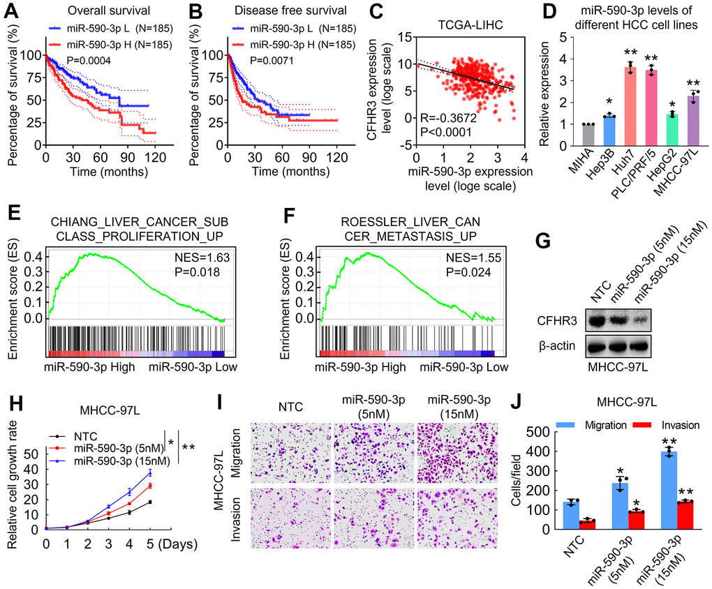 The molecular mechanisms of downregulation of CFHR3 in HCC were further explored. We noticed that as one of the 50 candidates that we screened out, miR-590-3p upregulated HCC cases showed significantly lower OS and DFS rates (Figure 3A, 3B). As we all know, miRNAs take part in RNA silencing and downregulation of gene expression [20]. Because levels of miR-590-3p showed an opposite role in OS and DFS as compared to CFHR3 in HCC cases, we first determined the association between CFHR3 and miR-590-3p, and it showed that the levels of CFHR3 were negatively correlated with the levels of miR-590-3p in TCGA-LIHC dataset (R=-0.3672, p<0.0001; Figure 3C). Also, miR-590-3p was highly expressed in CFHR3-low HCC cells (Huh7, PLC/PRF/5, and MHCC-97L) and was low expressed in CFHR3-high HCC cells (HepG2 and Hep3B) and MIHA cells (Figure 3D). In addition, liver cancer proliferation and metastasis-related gene signatures were shown to be enriched in HCC tissues with high miR-590-3p expression (Figure 3E, 3F). Furthermore, we selected the MHCC-97L cells that have moderate and appropriate levels of CFHR3 and miR-590-3p among the five different HCC cell lines (Figures 2C, 3D) for mechanism study in HCC. It indicated that miR-590-3p suppressed CFHR3 in a dose-dependent manner in HCC cells (Figure 3G). More important, miR-590-3p enhanced HCC cell proliferation, migration as well as invasion in a dose-dependent manner (Figure 3H–3J). Except for the HCC cells, miR-590-3p also promoted the cell growth, migration, and invasion of MIHA cells (Supplementary Figure 2A–2D). Collectively, these results suggest that CFHR3 is a potential effector for miR-590-3p regulating HCC cell malignant phenotypes.