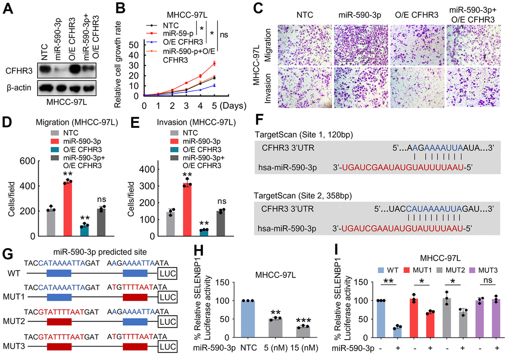 To further explore whether CFHR3 is a leading effector in the regulation of malignant phenotypes of HCC cells induced by miR-590-3p, we transfected CFHR3 overexpression HCC cells with miR-590-3p precursor (Figure 4A). It showed that the expression of CFHR3 reversed the promotion of HCC cell growth, migration as well as invasion induced by miR-590-3p (Figure 4B–4E). Furthermore, two miR-590-3p binding sites were identified within the 3′ UTR of CFHR3 by using the target algorithm analyses (TargetScan) (Figure 4F). To validate that suppression of CFHR3 mRNA was owing to the induction by miR-590-3p, luciferase reporter constructs harboring CFHR3 3’ UTR (wild-type and corresponding mutants) were cloned (Figure 4G). miR-590-3p overexpression decreased luciferase activities (Figure 4H). Luciferase activities were not changed by overexpression while the 3’ UTR sequences for the seed region of miR-590-3p were mutated in the two complementary sites (Figure 4I). Taken together, these results demonstrate that the low level of CFHR3 is induced by the binding of miR-590-3p with the 3’ UTR of CFHR3.