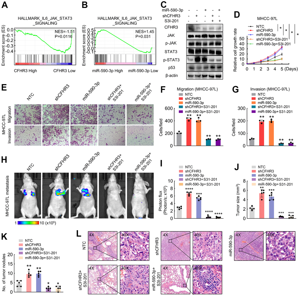 5-week-old male NOD-SCID mice were obtained from Charles River Laboratories in Beijing in China. Mice were divided into the experimental group by researchers with random allocation. For the in vivo lung metastasis assays, luciferase-labeled MHCC-97L cells transfected with shCFHR3-RNAs or miR-590-3p precursor were treated with S3I-201 (50μM) or DMSO (control) and injected (2 × 106 cells in 200 μL 1× PBS) into the mice in each group via tail veins. 6 weeks after the injection, the metastatic foci were visualized and analyzed.