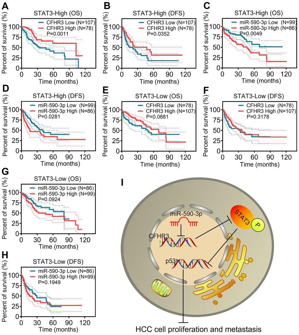 To further figure out regulation mechanisms in which CFHR3 downregulation promotes HCC cell malignant phenotypes, we performed GSEA analysis upon CFHR3 and miR-590-3p levels in TCGA-LIHC RNA sequencing data. It showed that genes related to JAK/STAT3 signaling showed enrichment in low-level-CFHR3 or high-level-miR-590-3p HCC tissues (Figure 5A, 5B), suggesting that the JAK/STAT3 pathway is likely to be potential downstream signaling upon the downregulation of CFHR3. Excessive activation of the JAK/STAT3 pathway was shown to play an essential role in the development and progression of different cancers [21–23]. Hence, we asked whether the HCC cell malignant phenotypes were enhanced by downregulation of CFHR3 is associated with activation of the JAK/STAT3 pathway. Interestingly, we found that reduction of CFHR3 induced by shRNAs of CFHR3 or miR-590-3p increased phosphorylation levels of STAT3, which was further suppressed by STAT3 inhibitor, S3I-201 (Figure 5C). In addition, the downregulation of CFHR3 did not alter the phosphorylation levels of JAK (Figure 5C). Previous studies have shown the normal growth and oncogenic signaling pathways in which phosphorylated STAT3 downregulates p53 gene expression [24–26]. As also shown in Figure 5C, p53 was altered reversely according to the status of phosphorylated STAT3, which means that phosphorylated STAT3 suppressed p53 in HCC cells. Furthermore, cell function assays showed that the promotional effects upon downregulation of CFHR3 induced by CFHR3 stable knockdown or miR-590-3p on HCC cell growth (Figure 5D), migration as well as invasion in vitro (Figure 5E–5G) as well as cell metastasis in vivo (Figure 5H–5L) were also attenuated by S3I-201. Moreover, p53 was decreased upon the increase of phosphorylated STAT3 due to the ectopic expression of STAT3, to antagonize the inhibition of HCC cell growth, migration as well as invasion induced by CFHR3 upregulation (Supplementary Figure 3A–3E). These data indicate that CFHR3 is specific and crucial for phosphorylation of STAT3 in HCC malignant phenotypes. Moreover, the survival analyses showed that in subgroups with high levels of STAT3, the HCC cases with CFHR3 downregulation or miR-590-3p upregulation presented worse OS or DFS (Figure 6A–6D). As for the subgroup with low expression of STAT3, low levels of CFHR3 or high levels of miR-590-3p did not exhibit the clinical significance in OS or DFS of HCC patients (Figure 6E–6H). Combined with our findings that miR-590-3p/CFHR3 regulated cell growth, migration, and invasion through STAT3 in HCC, here, we indicate that influence of CFHR3 on the prognosis of HCC patients is dependent on STAT3. Collectively, a miR-590-3p/CFHR3/p-STAT3/p53 signaling axis promoting HCC cell malignant phenotypes is elucidated (Figure 6I).