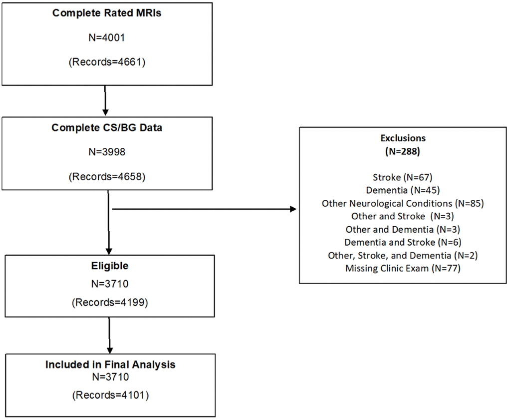 The flow chart of the sample selection is described in Figure 1. In total, there are 10,589 MRI scans from 5,594 FHS participants, of which 4,658 MRI scans from 3,998 participants had ePVS ratings. Exclusion criteria for the present study included refusal or contraindication for MRI (pacemaker or other implantable devices, metallic foreign body, claustrophobia), scans with significant artifacts precluding ePVS assessment, scans without a corresponding clinic examination, and history of clinical stroke, dementia, and neurological conditions that could affect brain MRI measurements (such as head trauma, multiple sclerosis, brain tumor). Following these exclusions the sample included 4,199 scans from 3,710 participants.