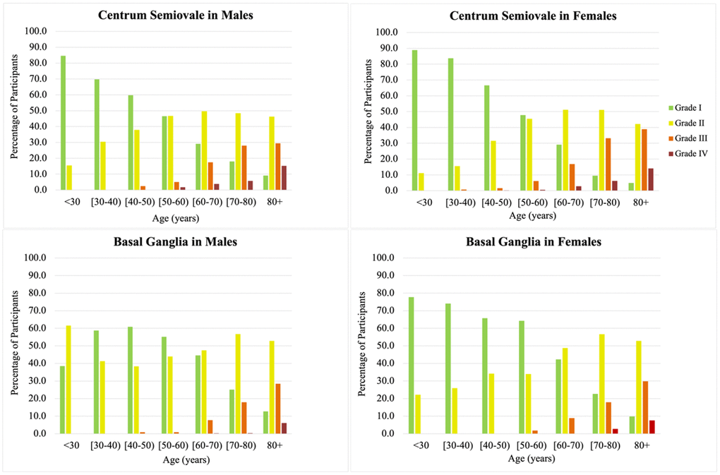 Baseline demographic characteristics of our sample by ePVS grade in each brain region are shown in Table 1. The prevalence of high ePVS burden increased in both brain regions as average age increased. High burden ePVS (grades III and IV) was low in participants younger than 60 years old, less than 10% in the BG and CSO (Figure 3). In contrast, most participants over age 80 had high ePVS burden in both the BG and CSO regions, with predominance in the CSO. No substantial differences were observed in the prevalence of high ePVS burden across brain regions between men and women throughout the life span, although in the overall sample a smaller proportion of males was noted in participants with grade IV ePVS in the BG (29% men, 61% women).