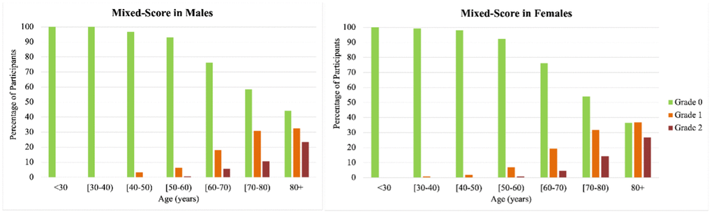 In our sample, the age at which high burden ePVS in either brain region was first detected was between 50 and 60 years (Figure 3). While ePVS were visible in all scans, the prevalence of severe ePVS in the BG, CSO and mixed brain regions increased steadily by age group for both men and women (Figures 3, 4). Overall, inspection of the data did not show meaningful differences between men and women. Among scans of participants 80 years of age and over, 50% had high ePVS burden (grade III-IV) in the CSO region and 36% in the BG region.