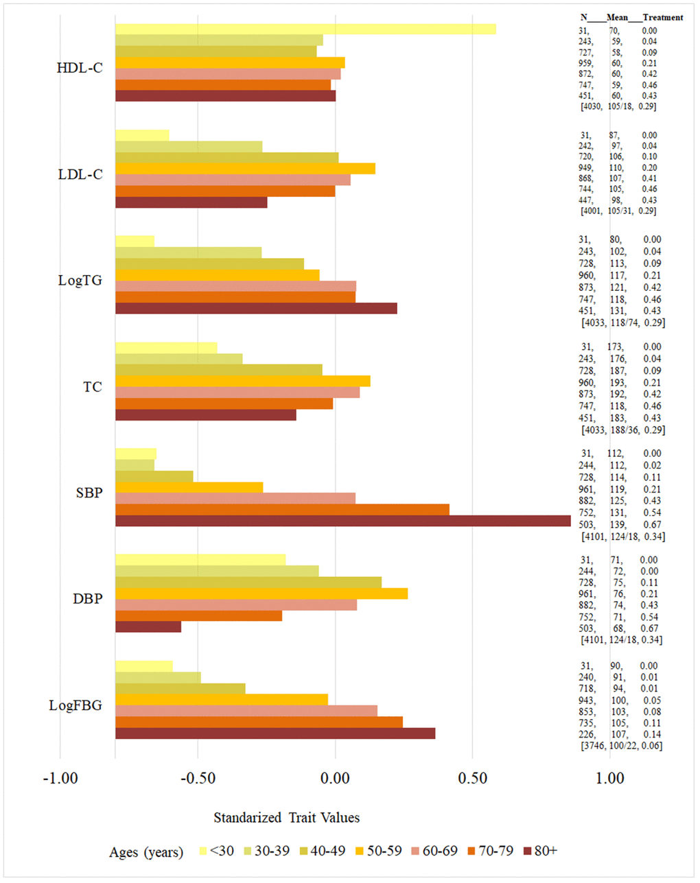 Vascular risk factors including SBP, hypertension, fasting blood glucose, and triglycerides increased with age. On the other hand, other measures including DBP, total cholesterol, and LDL also increased in age until age 50-59 and then progressively decreased (Figures 5, 6). Of note, treatment use for vascular risk factors increased with age and seemed to parallel the decrease in the factors noted above (Figures 5, 6).