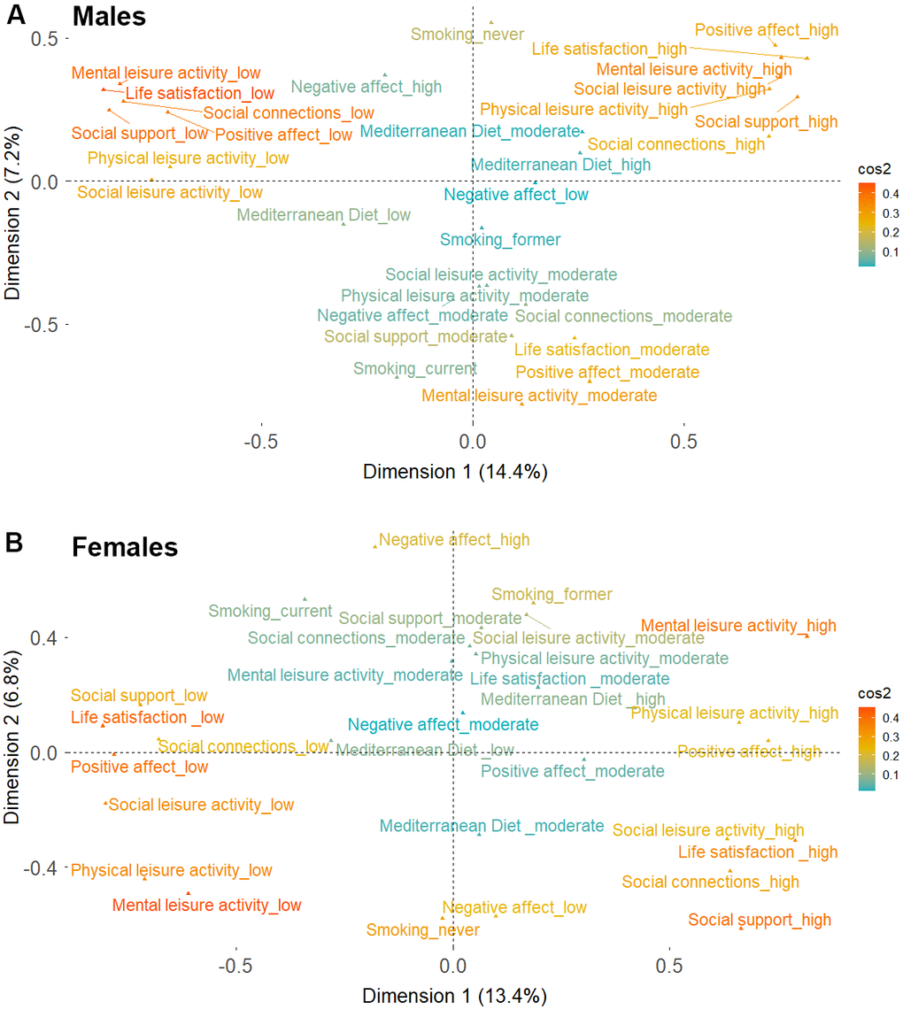 We carried out the following sensitivity analyses. First, in order to verify the robustness of the classes derived from LCA, we performed a data dimension reduction using multiple correspondence analysis (MCA), a generalization of principal component analysis (PCA) for categorical data. We used the obtained dimensions to plot the coordinates for every category of the 10 well-being indicators and their corresponding sum of squared Cosine (Cos2). Second, we further plotted the original data on a reduced two-dimensional grid, while labelling the observations with their corresponding well-being profiles obtained from LCA. Finally, we repeated the Cox and Laplace regression analyses: a) additionally adjusting by personality traits, b) excluding participants who were only interviewed at baseline, and c) excluding participants who dropped-out without developing mobility limitation or death.
