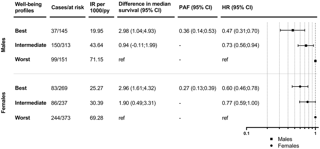 Men and women in the best profile were younger, with higher levels of education, had less chronic diseases at baseline, and had a lower incidence of the composite endpoint compared to those in the worst profile (Supplementary Table 3). The associations between the well-being profiles and the incidence of the composite outcome are shown in Figure 2. After adjusting for potential confounders, men and women in the intermediate profile had a 27% (HR 0.73; 95% CI 0.56-0.94) and a 23% (HR 0.77; 95% CI 0.59-1.00) lower hazard of developing the composite endpoint, respectively, compared to those in the worst profile. An even greater protective effect was seen among individuals in the best profile compared to those in the worst profile (HR 0.47; 95% CI 0.31-0.70 in men; HR 0.60; 95% CI 0.46-0.78 in women). We also show the outcome incidence rates across all well-being indicators and covariates in males and females in Supplementary Table 4.