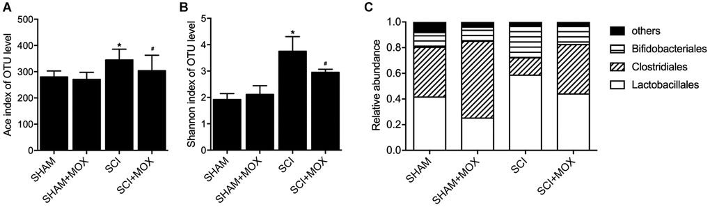 QIIME was used to measure the level and diversity of bacterial composition based on the OTU level in each group. Moreover, relative abundance of Lactobacillales, Clostridiales and Bifidobacteriales was also compared between different groups. As indicated by the results, the SCI group showed a significant increase in the Ace index (Figure 1A) and Shannon index (Figure 1B). Accordingly, MOX treatment significantly reduced the richness and diversity of the intestinal microbiota in SCI mice while exhibiting no effect in the SHAM group. As shown in Figure 1C and compared with the SHAM group, the induction of SCI markedly reduced the levels of Lactobacillales and Bifidobacteriales while elevating the level of Clostridiales. Accordingly, MOX treatment alleviated SCI-induced up-regulation of Clostridiales and down-regulation of Lactobacillales but exhibited no obvious effect on the level of Bifidobacteriales.
