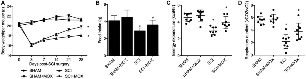 After comparing the body weight in all mouse groups from Day 0 to Day 28 after model establishment (Figure 2A), we found that the SHAM and SHAM+MOX groups showed stable and comparable values of body weight index, but the mice in the SCI group lost body weight after surgery, and MOX treatment gradually aimed weight gain in SCI mice. In addition, metabolic parameters including food intake, EE and RQ were assessed in each group. As shown by the results, the food intake (Figure 2B), EE (Figure 2C) and RQ (Figure 2D) of SCI mice were all evidently decreased, while MOX treatment significantly mitigated the reduction in these metabolic parameters in SCI mice. Noteworthy, MOX treatment upon sham-operated mice showed no effect on the indexes, indicating that MOX treatment was only effective in SCI mice.