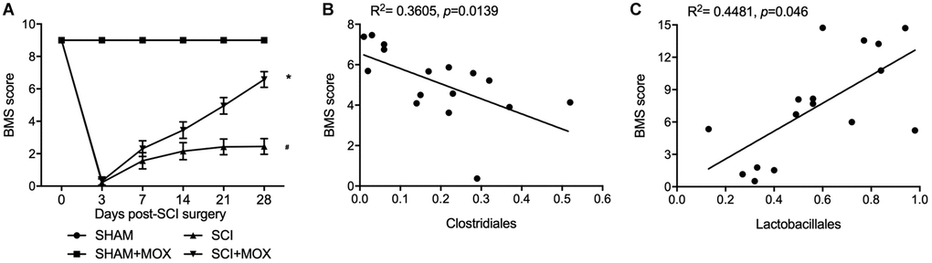 BMS was performed to evaluate the changes and subsequent recovery in locomotion of each group. As shown in Figure 3A, the BMS score remained unchanged in the SHAM and SHAM+MOX groups but was evidently reduced in the SCI group, and the subsequent post-SCI recovery was accompanied with a stepwise increase in the BMS score. Also, mice treated with MOX exhibited a greater improvement in locomotion activity. We also analyzed the correlation between Clostridiales/Lactobacillales and BMS score. As indicated by the results, the BMS score was negatively correlated with the level of Clostridiales (Figure 3B) and positively correlated with the level of Lactobacillales (Figure 3C), indicating the possibility of using certain bacteria to predict the functional recovery after SCI.