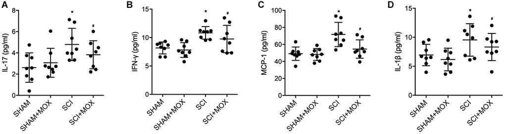 ELISA was performed to measure the levels of IL-17, IFN-γ, MCP-1 and IL-1β in each mouse group. Compared with those in the SHAM group, the levels of IL-17 (Figure 4A), IFN-γ (Figure 4B), MCP-1 (Figure 4C) and IL-1β (Figure 4D) were increased in the SCI group, and MOX treatment reduced the expression of IL-17, IFN-γ, MCP-1 and IL-1β in the SCI+MOX group. Moreover, no evident difference was observed between the SHAM+MOX and SHAM groups.