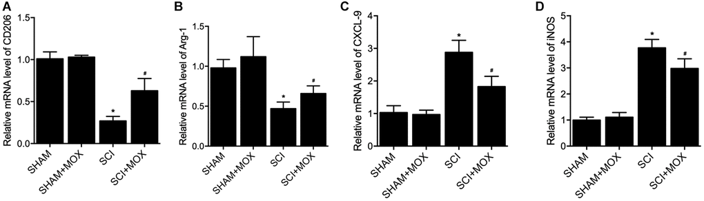 To measure macrophage polarization in each group, the expression of M1 markers including CXCL-9 and iNOS, as well as the expression of M2 markers including CD206 and Arginase-1, were observed in colonic macrophages. As shown in Figure 5, the level of M2 markers CD206 mRNA (Figure 5A) and Arg-1 mRNA (Figure 5B) were decreased in SCI mice, while the levels of M1 markers CXCL-9 mRNA (Figure 5C) and iNOS mRNA (Figure 5D) were increased in SCI mice. Furthermore, the dysregulation of these markers in SCI mice was recovered by the treatment with MOX.