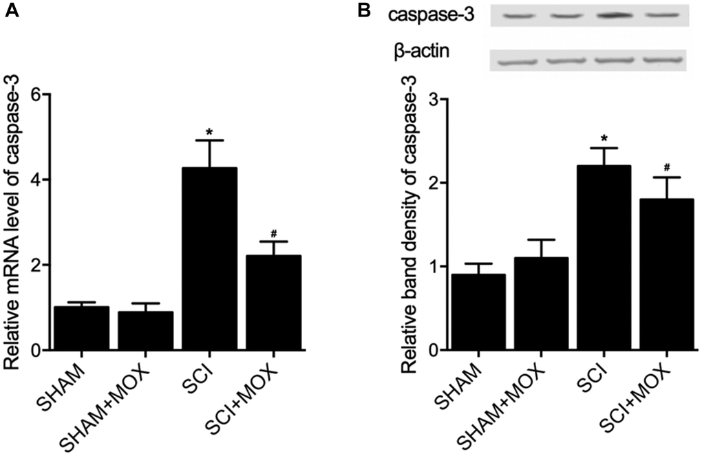 TUNEL assay was utilized to measure the apoptosis of cells in spinal cord tissues. As shown in Figure 6, the apoptotic index was most evidently increased in the SCI group, while the SCI+MOX group showed an apoptotic index lower than that in the SCI group. Moreover, compared with that in the SHAM group, the expression of caspase-3 mRNA (Figure 7A) and protein (Figure 7B) was also increased after the induction of SCI, and was reduced by MOX treatment in the SCI+MOX group.