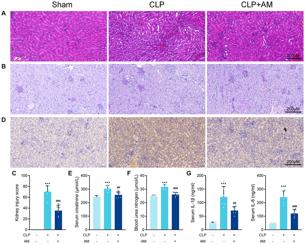 Astragalus membranaceus protects against renal injury in CLP-induced sepsis. In this study, the CLP model, a widely accepted mouse model of sepsis, was used to induce SA-AKI in C57BL/6J mice. Histopathological examination revealed that 24 hours after CLP surgery, the kidney tissue interstitial edema in the CLP mice was obvious, with diffuse neutrophil infiltration and severe glomerular wrinkling, while the tubular lumen was occluded, some cells were swollen and vacuolated, and the tubular cystic lumen was dilated. Further treatment with Astragalus membranaceus (AM) improved focal tubular damage, tubular swelling, and vacuolar degeneration as well as inflammatory cell infiltration and interstitial edema to varying degrees in mice kidney tissues (Figure 1A and 1B). Consistently, septic mice after AM treatment exhibited a markedly reduced kidney injury score (Figure 1C). Immunohistochemical analysis of kidney sections from treated septic mice revealed decreased staining for kidney injury molecule-1 (KIM-1) at the ends of renal tubular epithelial cells (Figure 1D). Furthermore, blood urea nitrogen (BUN) and creatinine levels, indicative of kidney dysfunction, were markedly decreased in mice of the treatment groups, suggesting preserved renal function for AM (Figure 1E and 1F). ELISA results confirmed that IL-6 and IL-1β concentrations in serum were deceased after AM treatment (Figure 1G).
