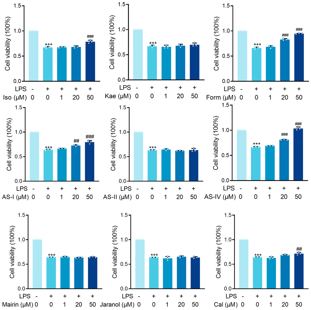 LPS significantly inhibited the survival rate of HK-2 cells (P < 0.001). Astragaloside I (AS-I) and Astragaloside IV (AS-IV) demonstrated dose-dependent protective effects at 20 μM versus 50 μM concentrations (AS-I: P < 0.01, P < 0.001; Form: P < 0.001, P < 0.001; AS-IV: P < 0.001, P < 0.001). At 50 μM Iso and Cal showed significant protection (P < 0.001). In contrast, treatment of HK-2 cells with Kae, AS-II, Mairin, and Jaranol did not result in any significant changes in the LPS-induced cytotoxicity (Figure 2). Our results demonstrated that AS-I, AS-IV, Iso, and Cal all exerted protective effects against LPS-induced HK-2 cytotoxicity in renal epithelial cells at 50 μM concentration, with AS-IV exhibiting the most pronounced protective effect. Therefore, we further investigated the mechanism through which AS-IV protects against septic acute kidney injury.