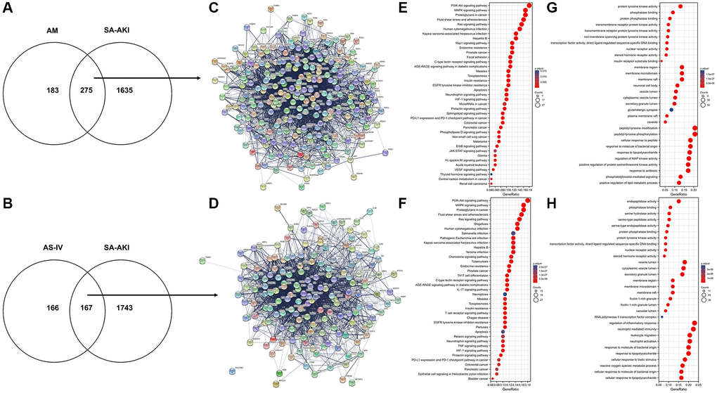 The therapeutic target database (TTD), Genecards, the Comparative Toxicogenomics Database (CTD), and the CTD were searched using the terms “sepsis” and “acute kidney damage (AKI). Genecards and the Comparative Toxicogenomics Database (CTD) were used to search for relevant disease targets, and the CTD database was used to identify experimentally validated disease targets designated as “marker/mechanism” or “therapeutic”. The CTD database selects targets with a high degree of confidence that has been experimentally validated with “marker/mechanism” or “therapeutic” as targets for research. Finally, 2498 sepsis-related genes and 6746 AKI-related genes were retrieved from the GeneCards database, while 48 sepsis-related genes and 120 AKI-related genes were retrieved from the CTD database. A total of 1938 targets were obtained after a comprehensive screening of all targets to eliminate duplicates, and the DAVID database validated a total of 1910 targets related to sepsis and acute kidney injury in humans. All genes were imported into the DAVID database, and the relevant genes were exported by selecting and clicking “show gene lis”. GO enrichment and KEGG pathway enrichment analyses were performed on the disease targets via the DAVID database, using P < 0.01 and False discovery rate (False discovery rate (FDR) <0.01 as the screening thresholds. A total of 686 entries for biological process (BP), 104 for cellular component (CC), and 121 for molecular function (MF) were obtained. The top 20 entries are displayed in Tables 2 and 3 below, are ordered by the magnitude of their P and FDR values. SA-AKI was predicted to be involved in biological processes such as the inflammatory response, immune response, intrinsic immune response, response to LPS, response to hypoxic factors, etc. The cellular components were involved in extracellular gaps, extracellular regions, molecular functions including protein binding, receptor binding, enzyme binding, etc. Astragalus and SA-AKI targets were intersected by Venn to obtain a total of 275 core targets (Figure 4A). AS-IV and SA-AKI targets were intersected by Venn to obtain a total of 167 core targets (Figure 4B). We further examined the relationship between the bio-active ingredients and the core targets, to construct an interaction network between the two (Supplementary Figure 2). A total of 26 active ingredients of Astragalus were identified to be critical to the core target. The high-degree nodes in the network exhibited a greater number of component-target-pathway interactions, which were likely to play a critical role in renal protective AKI. Following that, the Astragalus Target-SA-AKI Target-PPI Network input the compound targets into TCMSP and String databases. There were 275 nodes and 741 edges in the Astragalus Target-SA-AKI Target-PPI Network (Figure 4C). Similarly, the AS-IV Target-SA-AKI Target-PPI Network Input the compound targets into TCMSP and String databases. There were 167 nodes and 2413 edges in the AS-IV Target-SA-AKI Target-PPI Network (Figure 4D). We imported the 254 target genes of Astragalus anti-SA-AKI and the 167 target gene sets of AS-IV anti-SA-AKI into the DAVID version 6.7 database for Gene ontology analysis and KEGG pathway enrichment analysis, using three panels typically included in GO analysis. For Astragalus, a total of 241 MF entries, 3045 BF entries, 123 CC entries, and 169 KEGG entries were obtained. Following that, we screened at P < 0.01 and FDR <0.01 to extract significant card values and discovered 2028 entries under BP, 63 entries under CC, and 132 entries under MF. Figure 4E and Table 4 show the top 10 entries selected for visualization. As shown in Figure 4F and Table 5, 140 KEGG entries were selected for visualization. For AS-IV, 168 entries were obtained under MF, 2661 entries under BP, 64 entries under CC, and 147 entries under KEGG. We used P < 0.01 and FDR <0.01 as significant card values and obtained 1667 entries under BP, 43 entries under CC, and 89 entries under MF. The top 10 entries were selected for visualization, as shown in Figure 4G and Table 6. 114 entries under KEGG were selected for visualization, as shown in Figure 4H and Table 7.