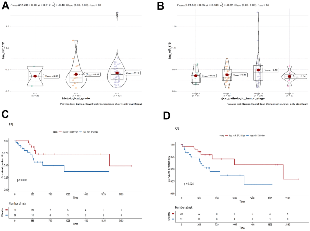 The TCGA database was used to elucidate the effect of miR-5701 in the GC tissues by bioinformatics approach. The expression of miR-5701 was lower in the GC tissues than in the healthy counterparts, and its expression was associated with the histologic and pathologic stages of GC (Figure 1A, 1B). The expression of miR-5701 was associated with progression-free interval (PFI, P=0.035), and overall survival (OS, P=0.024) in GC (Figure 1C, 1D), suggesting that miR-5701 played a key role as a tumor suppressor in GC.