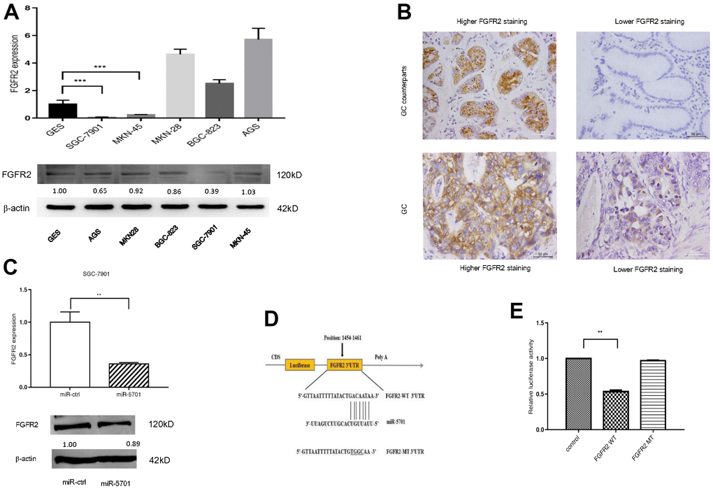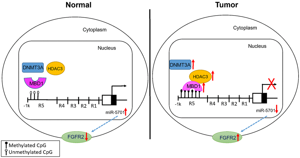 Therefore, our findings demonstrated that hypermethylation in GC led to the binding of MBD1 and HDAC3 and downregulation of miR-5701. Lower levels of miR-5701 in GC was coincident with the increased expression of FGFR2. The overexpression of miR-5701 in GC cells inhibited proliferation and migration in vitro and in vivo. Our results indicated the potential use of exogenous administered miR-5701 or agents that elevated endogenous miR-5701 to inhibit GC, improving the prognosis of patients with GC.