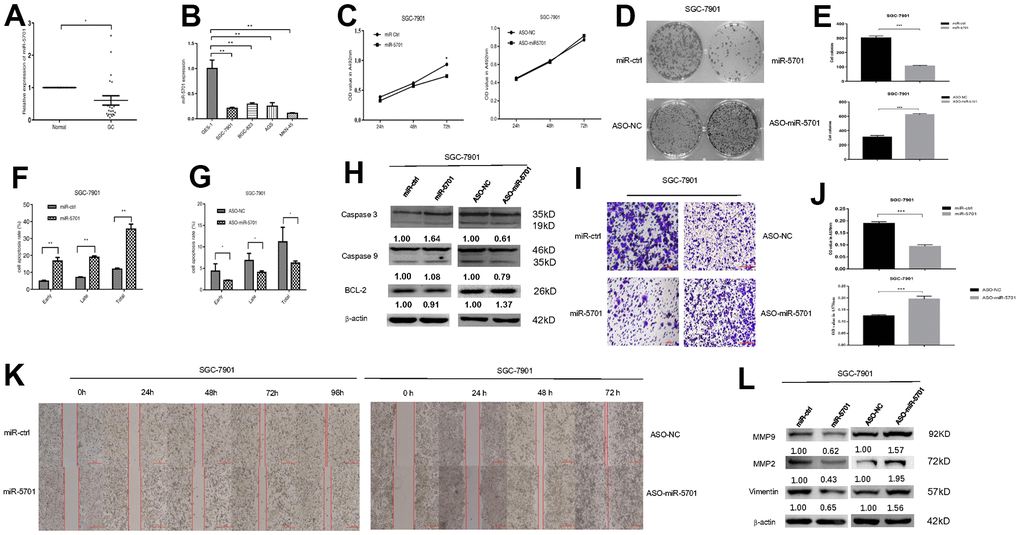 miR-5701 was downregulated in GC and acted as a tumor suppressor
