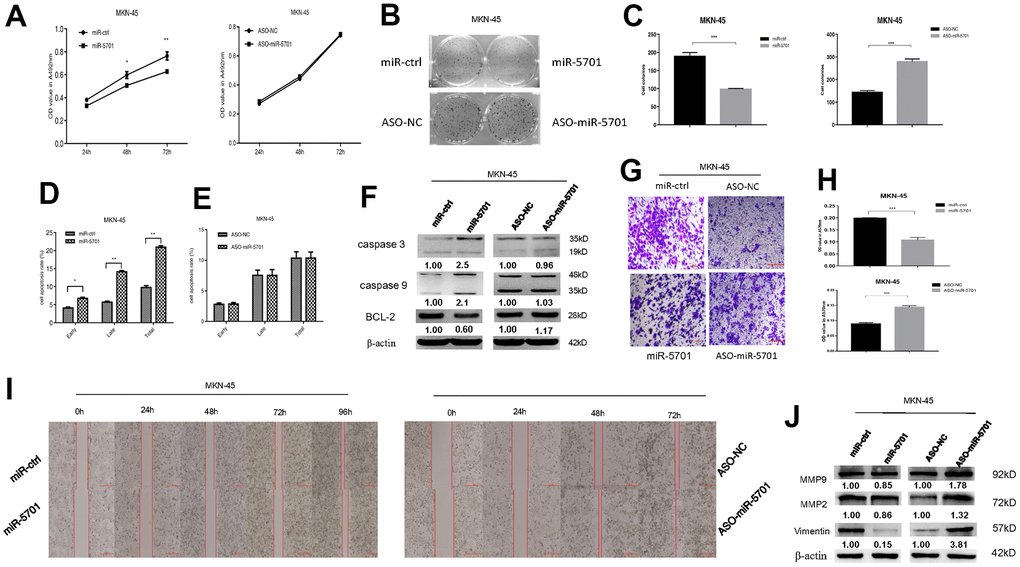 The miR-5701 expression in GC has not been reported yet. We first examined the levels of miR-5701 in the clinical GC samples and GC cell lines. Compared with the normal gastric tissues and normal gastric cell line, the expression levels of miR-5701 were significantly lower in the GC tissues and in several gastric cell lines (Figure 2A, 2B). To investigate the clinical significance of miR-5701 in GC, we divided patients with GC into high- and low-expression groups based on a previous PCR result. The results of the correlation analysis for the GC clinical features and miR-5701 expression are shown in the Table 1. We then tested the functions of miR-5701 in the GC cells. Overexpression of miR-5701 inhibited the cell viability of the GC cell line SGC-7901/MKN-45, while blockage of miR-5701 slightly promoted the cell viability in SGC-7901/MKN-45 cells (Figures 2C, 3A). Given that the basal level of miR-5701 in SGC-7901/MKN-45 was very low, blockage of miR-5701 just slightly promoted cell viability. Colony formation results showed that the overexpression of miR-5701 decreased the colony number, but blockage of miR-5701 increased the colony number of SGC-7901/MKN-45 (Figures 2D, 2E, 3B, 3C). Flow cytometry results also showed that overexpression of miR5701 promoted cell apoptosis, and blockage of miR5701 decreased apoptosis of SGC-7901/MKN-45 (Figures 2F, 2G, 3D, 3E), and apoptosis-associated proteins, such as caspase-3, caspase-9, and BCL-2, changed in the miR-5701 overexpressing cells and miR-5701 blocking cells (Figures 2H, 3F). Transwell and scratch results revealed that miR-5701 inhibited cell migration through the downregulation of migration-associated proteins, including MMP-2, MMP-9, and vimentin (Figures 2I–2L, 3G–3J). These results indicated that miR-5701 might be a tumor suppressor miRNA.