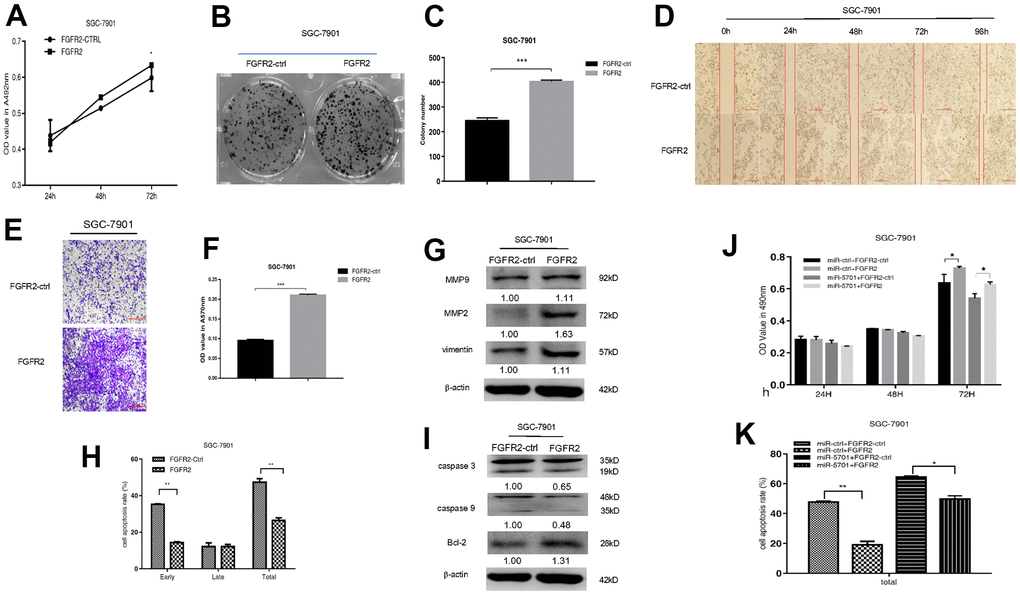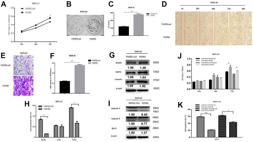 FGFR2 is frequently amplified and overexpressed in GC, but the clinic pathological impacts of high FGFR2 expression are not consistent among studies [16]. We constructed the overexpression plasmid of FGFR2 and transfected it into the SGC-7901/MKN-45 cells. The result showed that FGFR2 overexpression promoted cell viability (Figures 5A, 6A), colony formation (Figures 5B, 5C, 6B, 6C), migration, and invasion (Figures 5D–5G, 6D–6G) by increasing migration-associated MMP2, MMP-9, and vimentin. This overexpression also simultaneously decreased cell apoptosis by inhibiting caspase-3 and caspase-9 and activating BCL-2 (Figures 5H–5L, 6H, 6I). These results suggested that FGFR2 functioned as an oncogene in GC. We simultaneously overexpressed miR-5701 and FGFR2 in the GC cells. The results showed that miR-5701 counteracted the functions of FGFR2, inhibited cell viability (Figures 5J, 6J) and increased cell apoptosis (Figures 5K, 6K) regulated by FGFR2. Thus, FGFR2 acted as an oncogene to promote GC cell proliferation and migration, while miR-5701 was an antimiR to inhibit GC cell proliferation by targeting FGFR2.