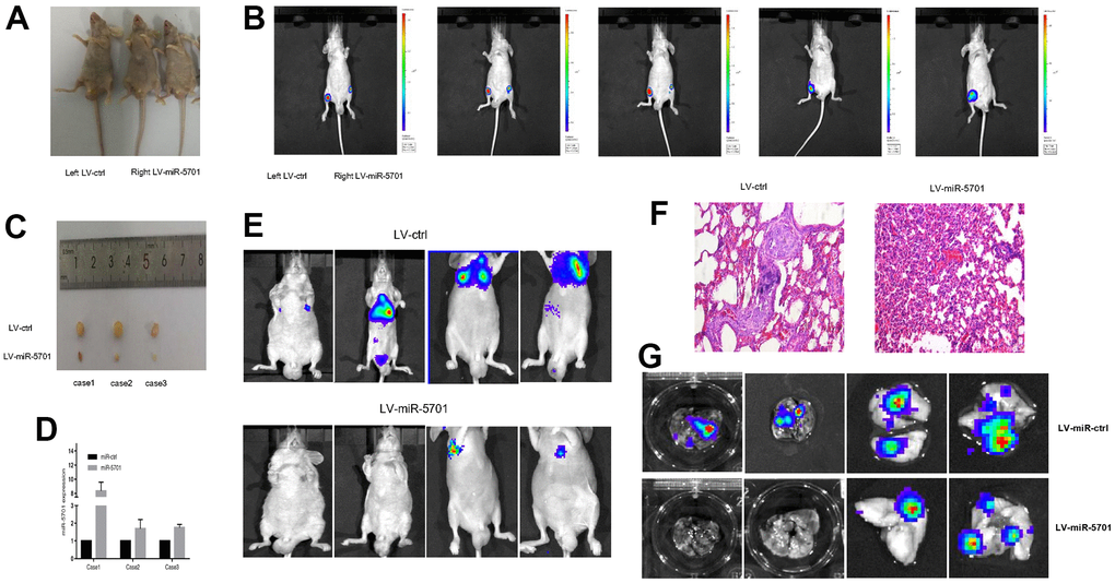 Aforementioned results indicated that miR-5701 acted as an antimiR to inhibit GC cell proliferation and migration. We then constructed a lentivirus containing miR-5701 and infected the GC cells. We injected these cells into the right lateral inguinal region of nude mice (Figure 7A) to assess the tumor proliferation and metastasis. The left inguinal region was injected with GC cells infected with LV-control. After four weeks, the tumor growth was markedly inhibited by LV-miR-5701 compared with the LV-control (Figure 7B), and the sizes of the tumors were obviously smaller than those of the control (Figure 7C). The qRT-PCR results confirmed that the miR-5701 expression levels were increased in the xenograft tumors (Figure 7D). Meanwhile, we also injected GC cells overexpressing miR-5701 into the caudal vein of nude mice to assess the effect of miR-5701 on the metastasis of GC cells in vivo. Compared with the LV-control group, miR-5701 reduced lung metastasis (Figure 7E–7G). These results further confirmed in vivo that miR-5701 played antitumor roles in GC.