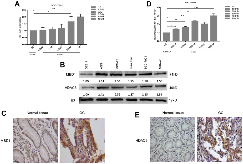 Based on the bioinformatics data, we sought to test the hypothesis that miR-5701 plays antitumor roles, and its expression is controlled by MBD1 and HDAC3 in GC. In the current study, we investigated the expression and role of miR-5701 in GC tissues and cell lines. The results showed that the expression of miR-5701 was indeed lower in GC and was apparently correlated inversely with the malignant behavior of GC. Overexpression of miR-5701 inhibited the proliferation and metastasis of GC cells in vivo, indicating the therapeutic potential of miR-5701.