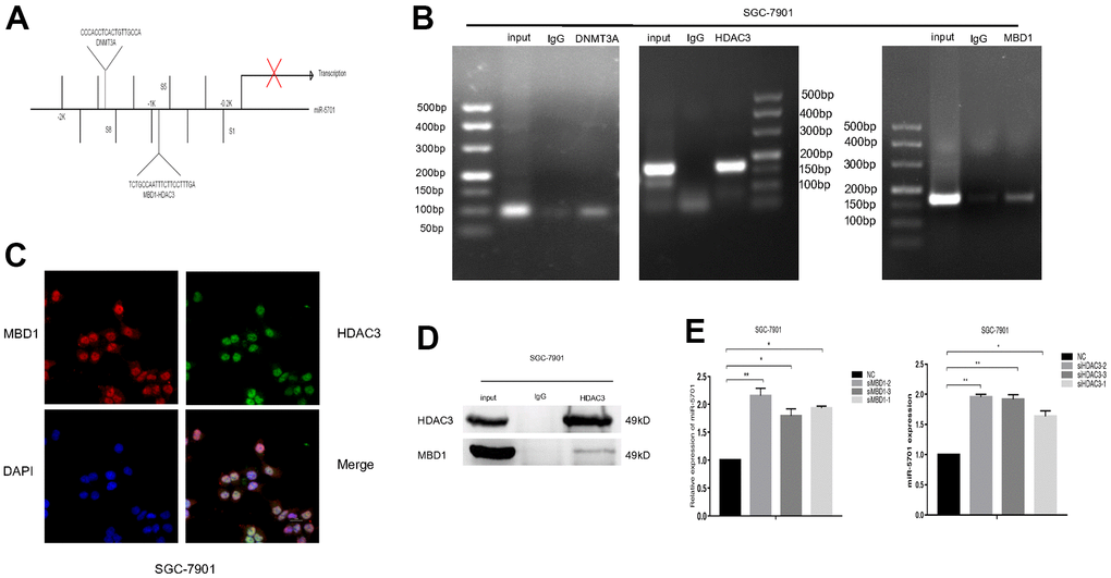 The expression and function of miRNAs were regulated by various factors, and DNA methylation, histone modifications, and noncoding RNAs are frequently involved in gastric carcinogenesis [8]. Methyl-CpG-binding protein 1 (MBD1) is a primary reader of DNA methylation and recruits methylases, histone deacetylases to methylated DNA [9]. The role of MBD1 in tumor progression regulation has been reported in cancers of the pancreas [10], prostate [11], and leukemia [12]. MBD1 utilizes its MBD and TRD domains to recruit transcriptional repressor proteins and silence tumor suppressor genes [13]. Previous studies [12, 14] have demonstrated that MBD1 might interact with HDAC3, which epigenetically regulates gene expression by acetylating lysine residues in the histone tails [15]. With the use of bioinformatics analysis, we predicted miR-5701 as a candidate target of MBD1 and HDAC3. Methylated sites might exist in the promoter region of miR-5701.