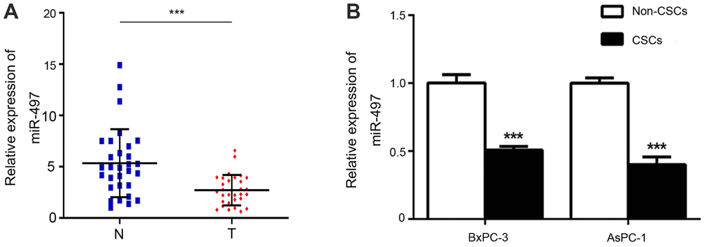 To investigate the role of miR-497 in pancreatic CSCs, we first verified the expression changes in miR-497 in pancreatic cancer tissues and CSCs and non-CSCs from Aspc-1 and Bxpc-3 cells. As shown in Figure 1A, miR-497 expression was significantly decreased in pancreatic cancer tissues compared with normal tissues. In addition, we discovered that high miR-497 expression was related to small tumor size (P=0.003) and low TNM stage (P<0.001) (Table 1). As for Aspc-1 and Bxpc-3 cells, CSCs and non-CSCs were prepared, and subsequent analysis showed that miR-497 was expressed at lower levels in the CSCs (Figure 1B). Taken together, these findings indicated that miR-497 is aberrantly expressed in pancreatic cancer cells and tissues and might be associated with certain characteristics of CSCs.