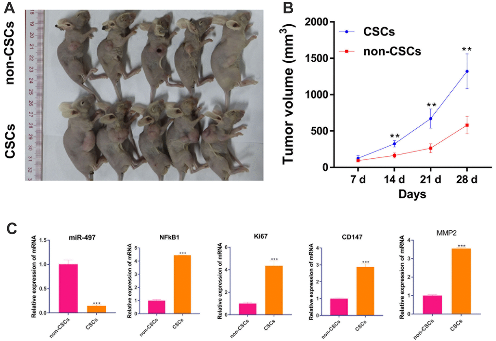 After confirming the biological function of CSCs and non-CSCs on cell proliferation in vitro, we explored the effect of CSCs and non-CSCs on tumor growth in vivo. As expected, the volume of xenograft tumor from CSCs cells were much larger than tumors from non-CSCs (Figure 10A, 10B). Moreover, the mRNA expression of miR-497/ NFkB1 /Ki67/ CD147/MMP-2 pathway in tumor were measured by RT-qPCR. Compared to the non-CSCs group, the mRNA expression of NFkB1 /Ki67/ CD147/MMP-2 were upregulated in CSCs group. But, miR-497 were decreased in CSCs group (Figure 10C). Those results suggest that CSCs promote tumor growth in vivo than in non-CSCs.