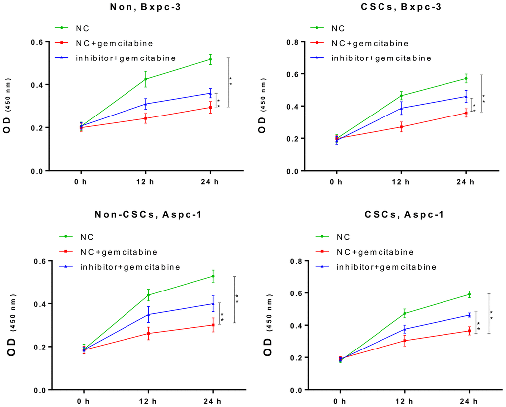 Next, we further confirmed the impact of miR-497 inhibition on the gemcitabine resistance of CSCs and non-CSCs from Aspc-1 and Bxpc-3 cells. After transfection with the miR-497 inhibitor, a significant increase in the viability of both CSCs and non-CSCs was observed (Figure 3). This suggested that miR-497 inhibition leads to gemcitabine resistance that might be associated with the gemcitabine resistance property of CSCs in populations of ASPC-1 and Bxpc-3 cells.