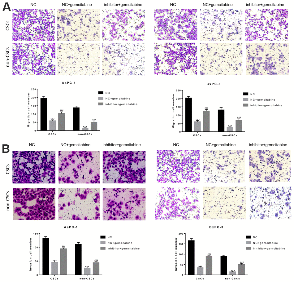 To further examine the roles played by miR-497 in the migration and invasion of CSCs and non-CSCs from Aspc-1 and Bxpc-3 cells, the cells were transfected with a miR-497 inhibitor, and cell migration and invasion were examined. As shown in Figure 4A, the migration of both CSCs and non-CSCs was significantly reduced after gemcitabine treatment compared with that of cells that received NC treatment. This inhibitory effect was significantly suppressed in cells transfected with the miR-497 inhibitor. Likewise, a reduction in gemcitabine-induced inhibition of cell invasion was noted after miR-497 transfection (Figure 4B).