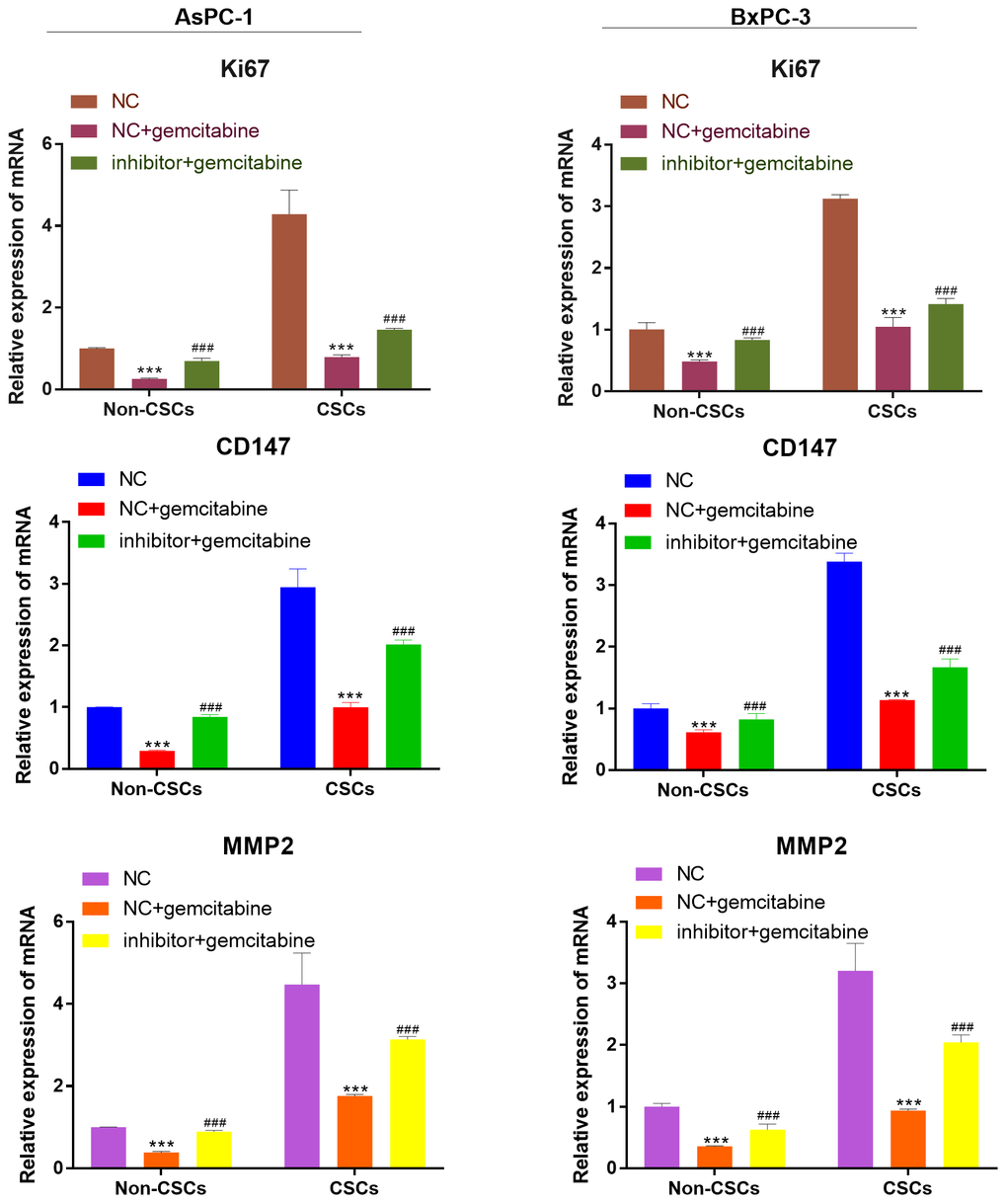 As detected by RT-qPCR, the mRNA expression of viability, migration, and invasion biomarker genes (Ki67, CD147, MMP-2) were markedly reduced after gemcitabine treatment compared with that of cells that received NC treatment. However, this expression was reversed by miR-497 inhibitor (Figure 5).