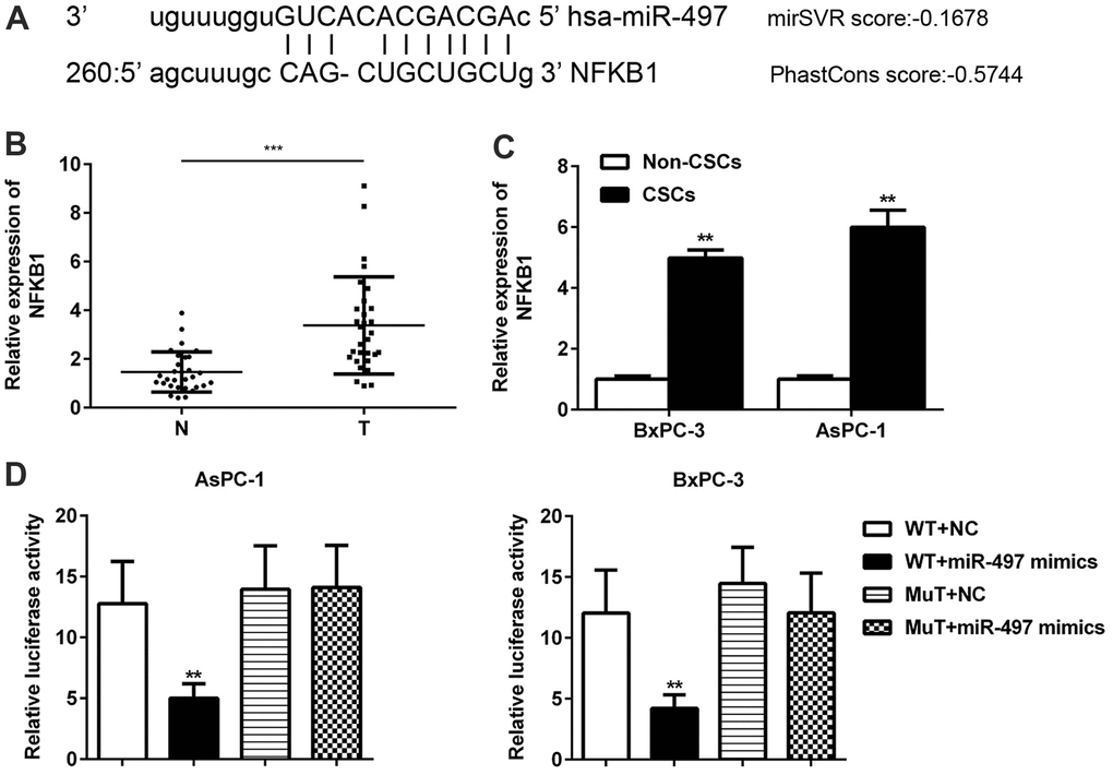In addition, we further searched and verified the potential target genes of miR-497 using the bioinformatics software package miRanda. The data showed that miR-497 contained binding sites for NFκB1 mRNA (Figure 6A). In contrast to miR-497 levels, we found significant increases in the levels of NFκB1 in CSCs when compared with normal tissues (Figure 6B). A comparison of CSCs and non-CSCs prepared from Aspc-1 and Bxpc-3 cells revealed significantly higher levels of NFκB1 in the CSCs (Figure 6C). These data suggested that NFκB1 might be negatively regulated by miR-497. A further assay showed that miR-497 mimics significantly decreased luciferase activity in the NFκB1 3’-UTR WT but had no effect on luciferase activity in the 3’-UTR MT (Figure 6D). These findings suggest that NFκB1 is a direct target of miR-497.