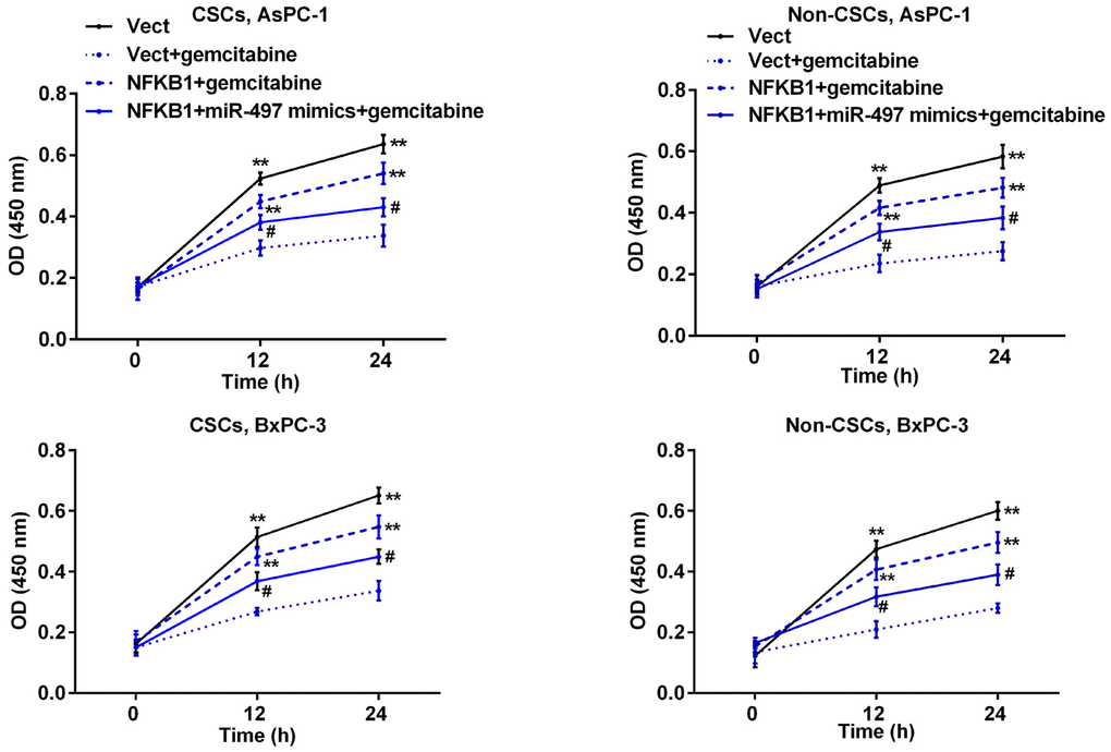 Subsequently, we further examined how NFκB1 can affect the sensitivity of pancreatic cells to gemcitabine. Pancreatic cells were transfected with the NFκB1 overexpression plasmid and then exposed to gemcitabine. As shown in Figure 7, transfection with the NFκB1 overexpression plasmid significantly increased the viability of CSCs and non-CSCs prepared from Aspc-1 and Bxpc-3 cells when compared to cells transfected with the empty vector, suggesting that NFκB1 helps to protect cells against the cytotoxic effects of gemcitabine. However, this protective effect was markedly attenuated by additional transfection with miR-497 mimics.