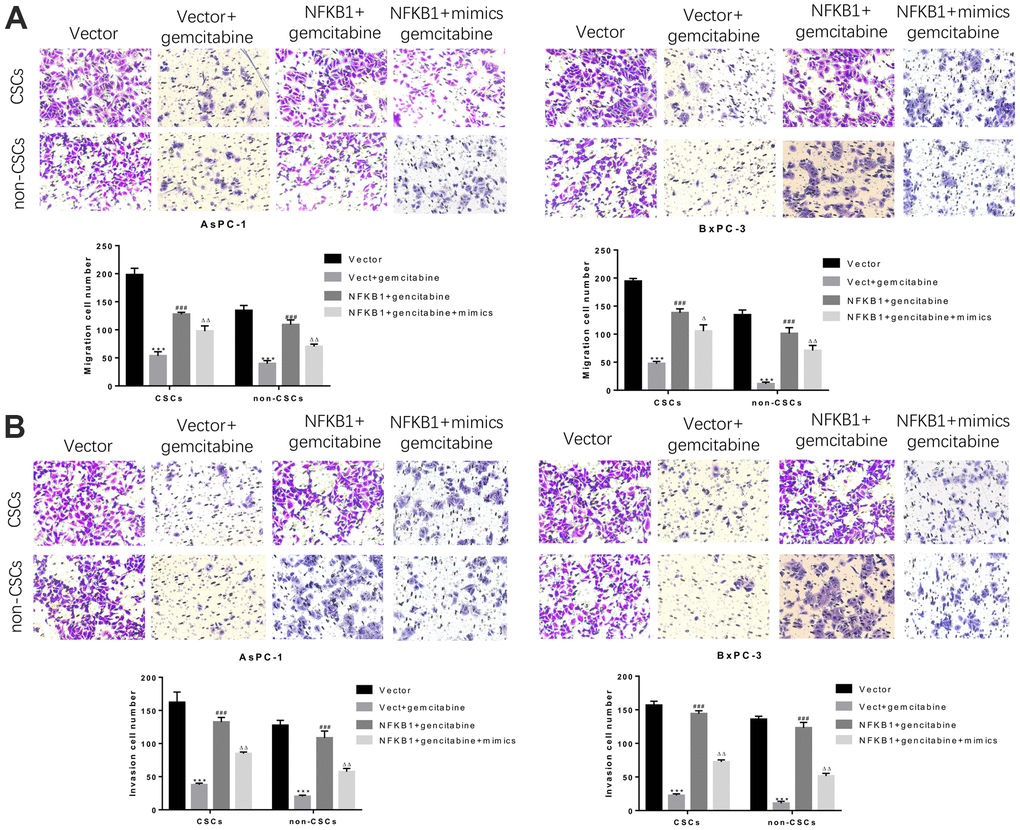 Similarly, we further assessed whether NFκB1 could weaken the inhibitory effect of miR-497 on the migration and invasion of CSCs and non-CSCs from Aspc-1 and Bxpc-3 cells. The results confirmed that NFκB1 transfection significantly attenuated the gemcitabine-induced reductions in cell migration and invasion, and those effects were markedly suppressed by transfection with miR-497 mimics. All these findings indicated that overexpression of NFκB1 confers gemcitabine resistance, which could be attenuated by miR-497 mimics (Figure 8A, 8B).